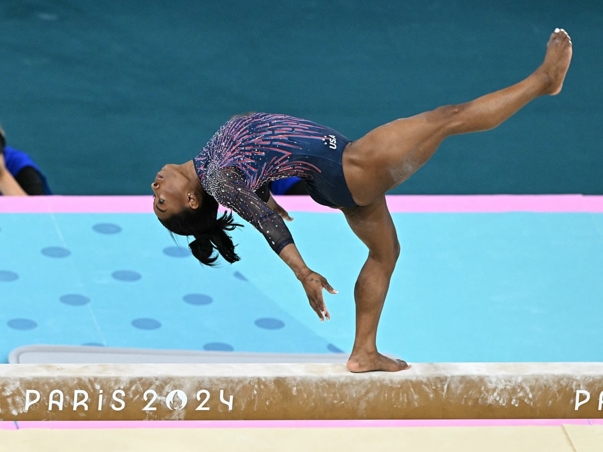 US gymnastics star Simone Biles after competing on the beam in the women’s gymnastics all-around during the Paris Olympics.