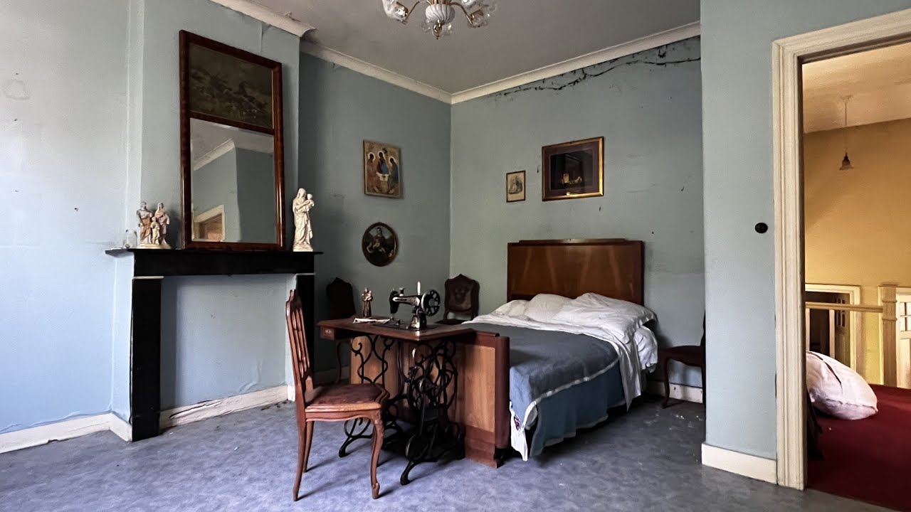 A sewing machine rests in the corner, still mounted on its original table. Patterns and photographs surround it. Personal. Intimate. Frozen.