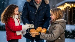 As they approached the bakery, Wyatt noticed a small girl, no more than nine years old, standing outside in the biting cold. Her thin jacket hung loosely on her frail frame, and she was desperately trying to sell bread. “Please, fresh bread,” she called out, her voice barely audible over the howling wind. The sight of her made Wyatt’s heart ache. He glanced down at the grocery bags filled with festive treats for their Christmas morning breakfast and felt a wave of guilt wash over him.