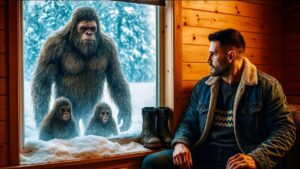 Towering at least eight feet tall, covered in matted fur caked with ice, the figure swayed in the blizzard, weakened by the cold. Its massive hands pressed against the door, and its deep-set eyes met Marcus’s with unmistakable intelligence. Behind the giant, two smaller forms huddled against its legs—juveniles, shivering violently, their fur too thin for the lethal cold. The parent shielded them, but even its enormous frame was losing the battle against nature.