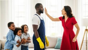 Serena crossed the hallway, spotted him, and frowned. “Clean fast. Don’t make noise.” She waved him off with a careless flick of her hand. Adrien lowered his head, jaw tight, watching her disappear into the living room. His daughter peeked from the staircase, eyes wide, shoulders stiff, holding her breath until Serena was gone.