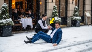 As Daniel stepped out of the car, he felt confident, but that confidence quickly vanished as he slipped on the icy pavement. His expensive leather shoes failed to grip the surface, and in a split second, he was falling backward, his briefcase scattering papers across the ground. The fall knocked the wind out of him, leaving him stunned and staring up at the gray sky as snowflakes melted on his face.