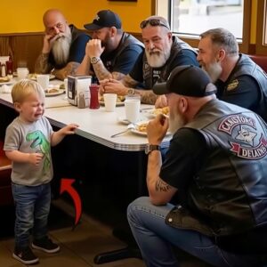 At the corner booth sat fifteen men—leather vests, sun-creased faces, the kind of presence that hushes a room without a word. They were veterans and bikers, regulars who kept to themselves, a brotherhood that spoke the language of long roads and longer memories. When the boy placed seven crumpled dollars on their table, his hands trembling, the air around them seemed to crystallize.