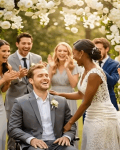Her trembling hands dropped the bouquet; petals scattered, mirroring her shattered dreams. The groom, Michael Adawale, sat motionless in a wheelchair—his body propped up, his chest rising and falling only by the mercy of a ventilator. The crowd whispered, “She’s marrying a ghost.” His family stifled laughter, mocking Aisha’s every word to the unconscious man beside her.