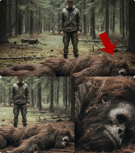 I stopped roughly twenty feet away, raising my rifle as my mind tried to process what I was seeing. The creature lying in the depression was enormous. Even curled on its side, it appeared more than eight feet tall. Dark brown fur covered most of its body, matted with blood and dirt. But what shocked me most was its posture. The limbs were positioned like those of a human being, not a quadruped animal.