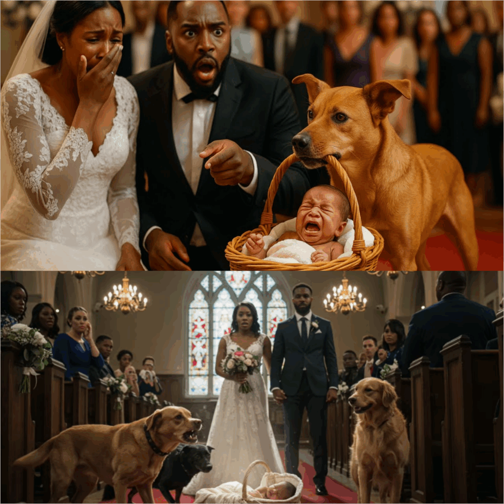 Just as the pastor raised his hand to begin the vows, a loud bark echoed through the hall. The music stopped. Heads turned. At the open church doors stood three dogs, one in front, two behind, moving with strange purpose. The lead dog carried a small basket in its mouth, and the other two flanked it like bodyguards. The crowd gasped. “Who brought dogs here?” someone whispered.