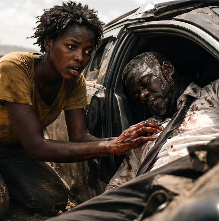 A scream of tires shattered the air. Grace was sitting near the highway divider, counting her meager earnings when she saw it. A sleek black luxury car swerved violently, its wheels skidding on the asphalt. Another vehicle clipped it from the side, and metal crumpled as glass shattered like rain. The impact was deafening. People shouted and screamed. Dust rose into the burning sunlight, thick and choking.