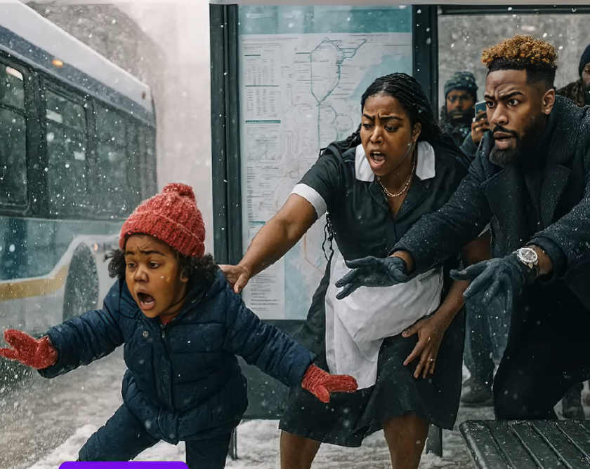 Immani’s eyes snapped open. Zara slid off her lap, tiny boots scraping the frozen bench, arms flailing toward the curb. A man in a dark coat lunged first. He caught the little girl at the edge of the pavement, turned his back to the danger, and wrapped her tight as the bus screamed to a halt inches away. Brakes hissed, people gasped, then the crisis passed.