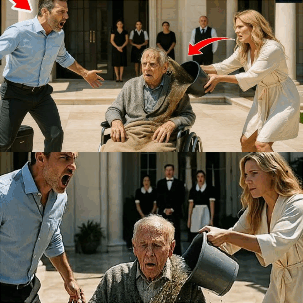 Vanessa Langford, his glamorous wife, stood in the center of the courtyard, a silver bucket slipping from her trembling hand. Its filthy contents had just been emptied, streaming down the front of Arthur Langford’s wheelchair and soaking the hem of his blanket. Arthur, Ethan’s 78-year-old father, sat motionless, his cloudy eyes blinking in shock. The stroke had stolen his voice, leaving only a faint whimper escaping his lips. The stench of bleach and dirty water filled the air.