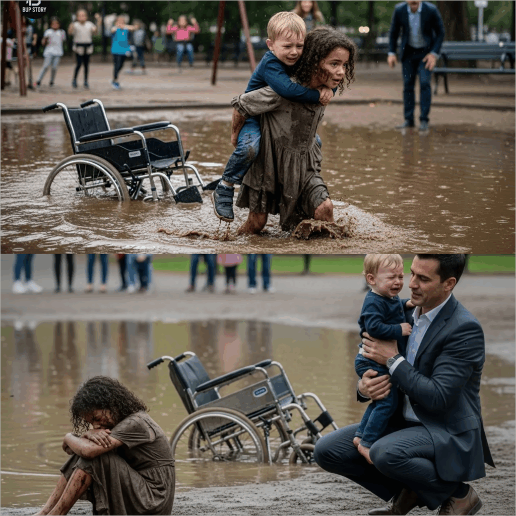 One gray afternoon, Ethan sat in his wheelchair near a park puddle, his toy car slipping from his grasp into the muddy water. Panic filled his small face as the chair tilted, sinking slightly into the mud. Strangers passed by, not noticing his distress. But Anna, a six-year-old girl from a poor family, saw him. Without hesitation, she ran over, her thin shoes splashing through the water.