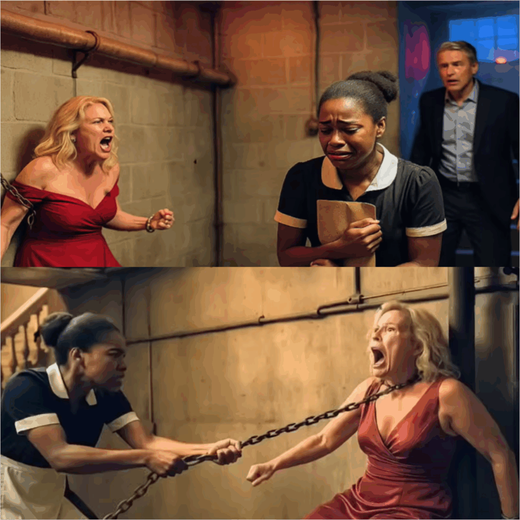 Naomi Williams, a young Black woman working as a maid, stood in the basement, her hands trembling around a cold iron chain. Across from her, Victoria Hail, the billionaire’s wife, struggled desperately, the chain coiled around her neck.