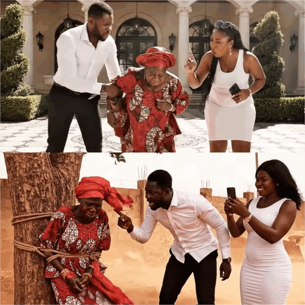 The Lagos wind whipped hard through the dusty backyard. An elderly mother’s silver hair, clinging to her tear-stained face, was tied to a tree like a criminal. Her wrists were swollen and bruised, her lips trembling with every broken breath.