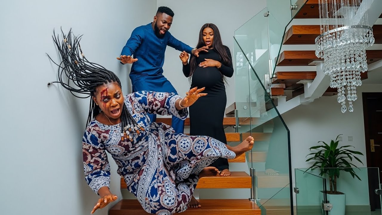 Behind him, perched halfway up the stairs like a serpent coiled to strike, stood Bisola, his mistress—seven months pregnant, glowing with malicious satisfaction. Her voice slithered into the chaos, sweet and venomous.