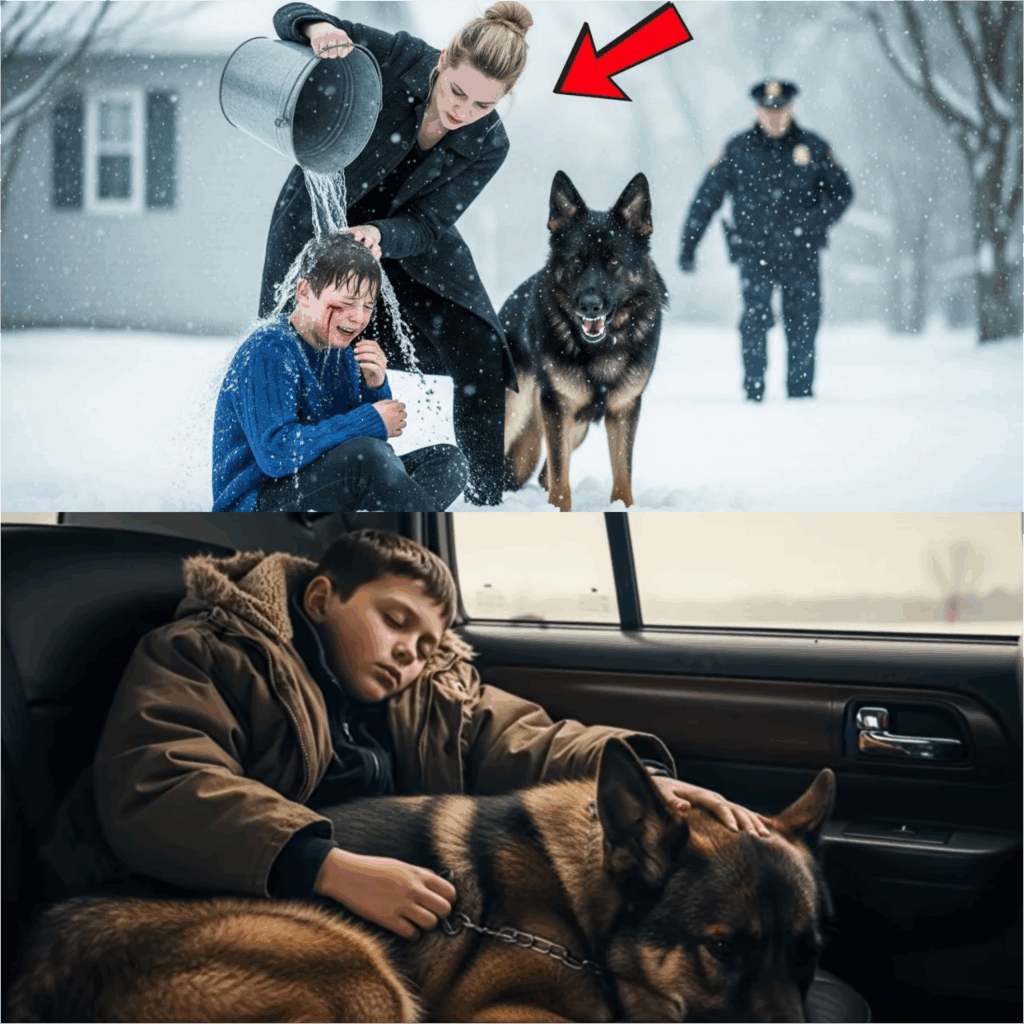 Officer Jack Morales arrived, flashlight angled, hands open. “Easy,” he said to the dog, then knelt beside the boy. “What’s your name?” “Caleb,” the boy whispered. “I’m cold.” Jack wrapped his jacket around Caleb, who sank into the warmth, clutching his bear tighter. Jack’s eyes flicked to the door, noting the wet porch and scuffed boot marks. He hadn’t seen the act, but the aftermath was clear.