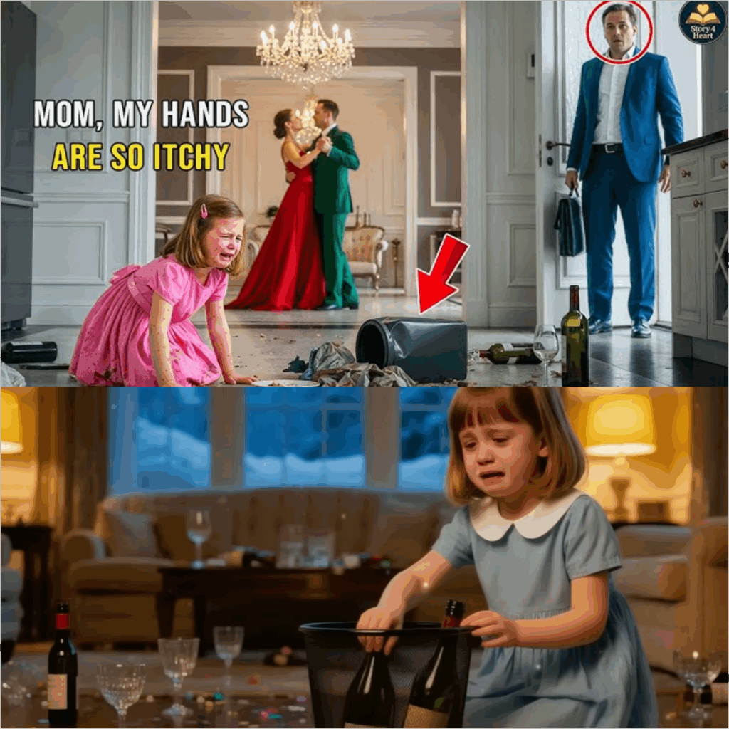 Six-year-old Lily knelt on the cold kitchen floor, quietly picking up shards of a broken wine bottle. Her stepmother Monica’s laughter echoed through the house as she spun in the arms of her dance instructor, Damien. The music was loud, the atmosphere festive—except for Lily, whose small hands trembled as she dropped each empty bottle into the trash.
