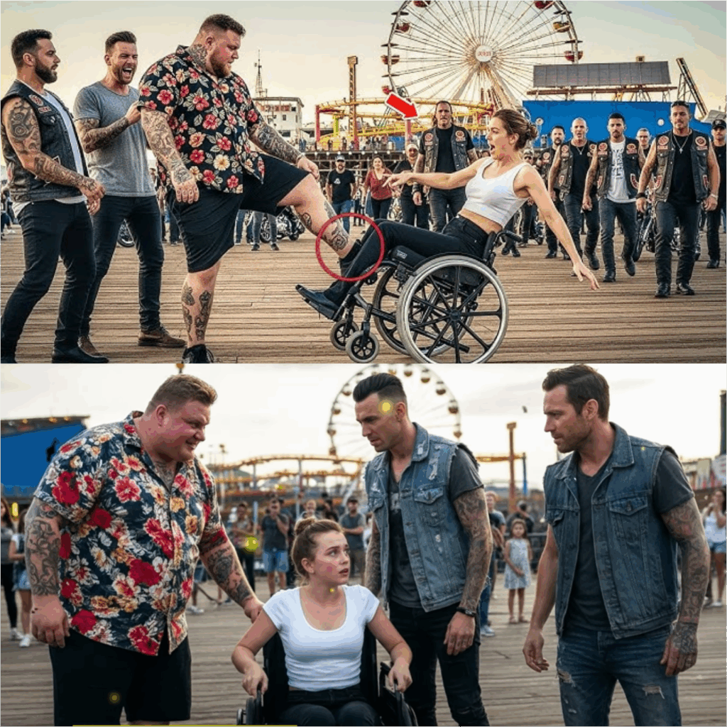 One of them leaned close and sneered, “Move, cripple!” The words sliced through her like a knife. Marissa froze. She had grown accustomed to whispers behind her back, but this was different. This was loud, cruel, and public. Before she could react, the man in the floral shirt laughed and swung his boot toward her wheelchair. The impact jolted her chair, sending it teetering sideways. She gasped, one hand shooting out to steady herself while the other clutched the wheel. She almost fell onto the pier planks.