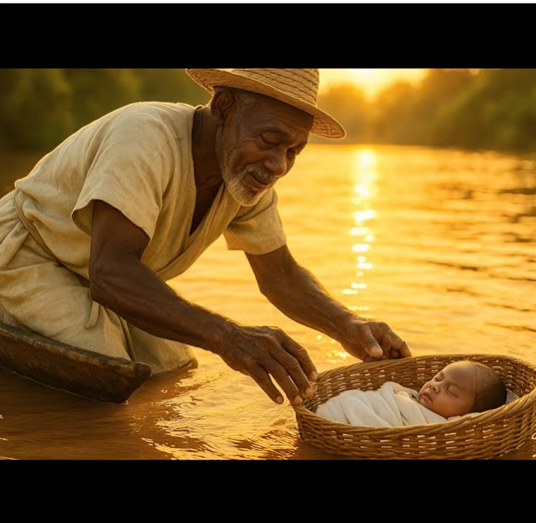 Now, standing by the river, Enmili wept. “My Chiamaka, forgive me. I have nothing. No home, no food.” With trembling hands, she lowered the basket onto the water. The river caught it gently, carrying it downstream. Enmili pressed her hands to her chest, then turned away, disappearing into the forest, a mother left with nothing but regret.