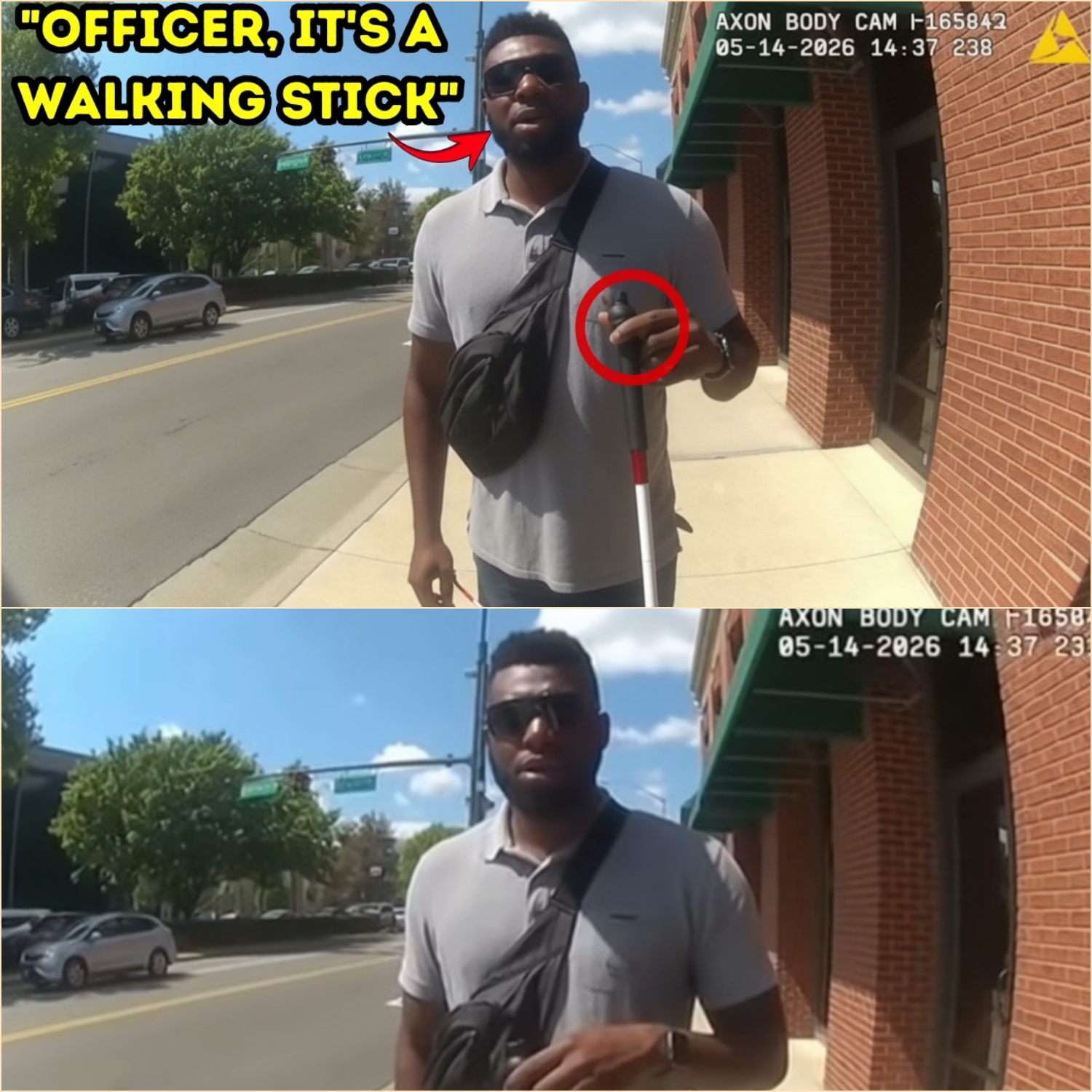 Even while examining the cane more closely—now clearly visible with its red reflective markings—the officer refused to admit he might have made a mistake.