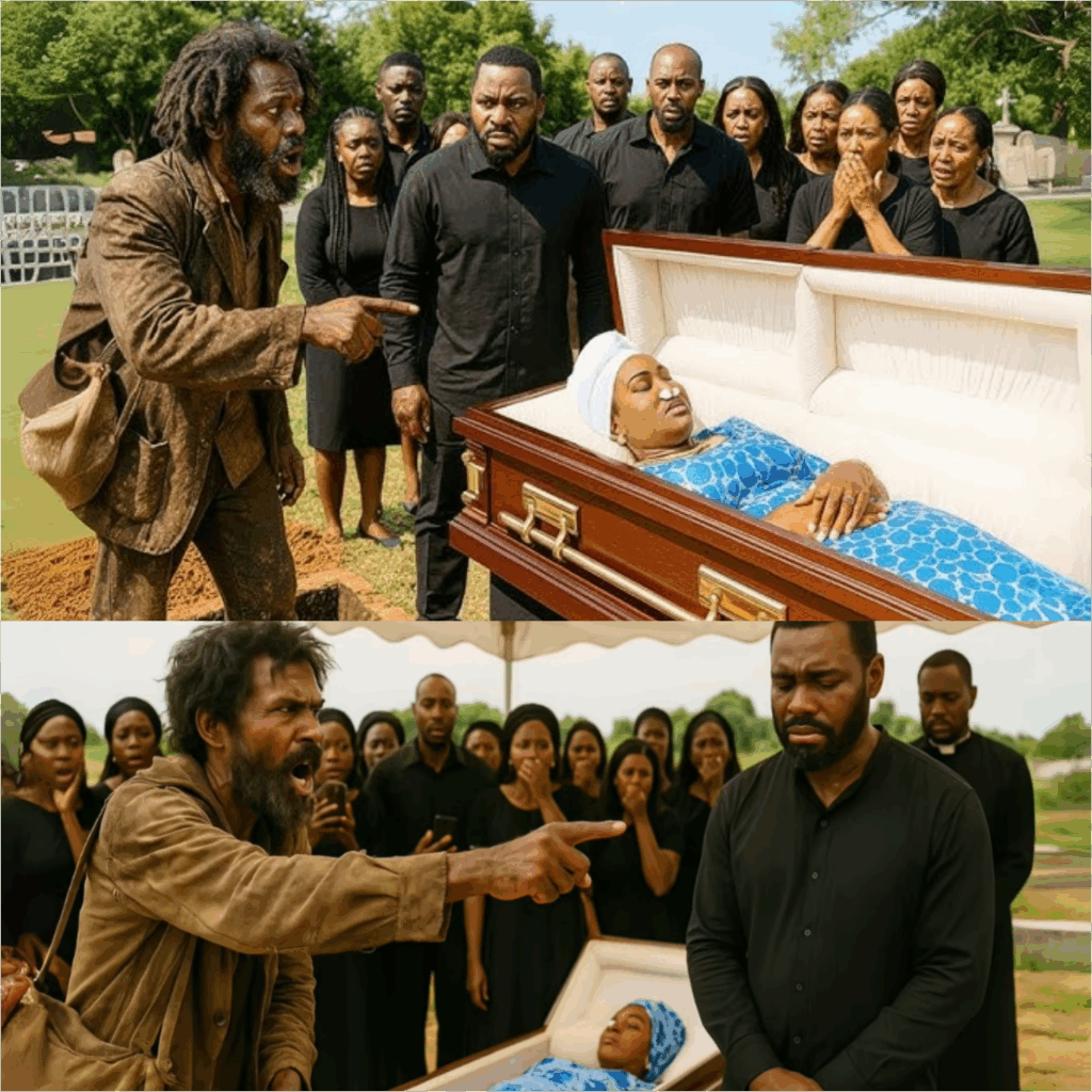Just as two grave workers stepped forward to lower the casket, a voice tore through the silence. “Stop! Don’t bury her!” Heads turned, phones raised to record the unfolding drama. At the back, a man in a tattered brown coat pushed through the crowd. His beard was wild, his eyes fierce. People recoiled, whispering, “Who is this? A homeless man?”