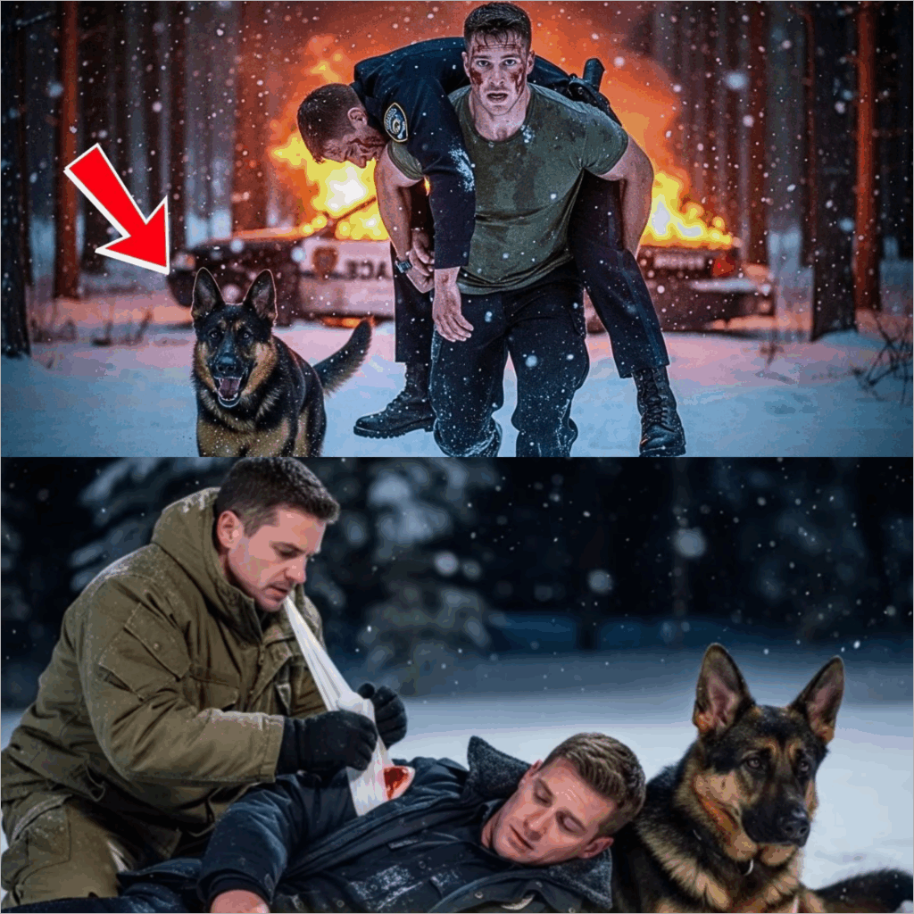Bolt led him down a slope, paws crunching in the snow. Mason’s flashlight revealed a black-and-white police cruiser half-buried in drifts, its windshield shattered by bullet impacts. The driver’s door hung open, and blood stained the snow, trailing toward a thicket. Mason found a young officer, face down, one arm twisted, the other clawed into the snow. Mason rolled him over gently. The badge read “Harlon.” The officer’s shoulder had been torn by a bullet, blood soaking his uniform. Mason pressed two fingers to his neck—weak pulse, but alive.
