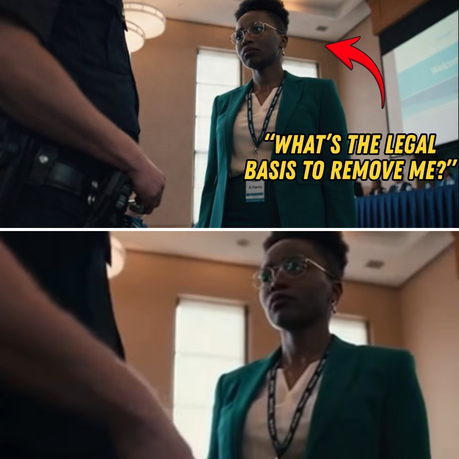 Instead of verifying her credentials, Delaney insisted that she needed to leave the restricted section of the conference hall. His tone was sharp, impatient, and dismissive, and he attempted to escalate the situation without any real cause. “I need you to stand up and exit the room,” he demanded.