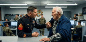 His eyes, sharp and intelligent, swept the room, taking in the scene in a fraction of a second: the frozen Marines, the fuming Major Kent, and the quiet old man at the counter. The entire office scrambled to their feet, snapping to the most rigid form of attention they could manage.
