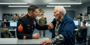 His eyes, sharp and intelligent, swept the room, taking in the scene in a fraction of a second—the frozen Marines, the fuming Major Kent, and the quiet old man at the counter. The entire office scrambled to their feet, snapping to the most rigid form of attention they could manage.