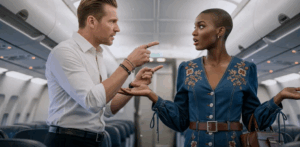 Late afternoon sunlight poured through the tinted oval windows of Luminina Air flight 428 bound for New York. The first-class cabin glowed in soft amber—a world of leather seats and crystal glasses, where power usually moved quietly. Among the passengers sat Dr. Karen Hayes, dignified in her late forties, her close-cropped natural hair framing a face etched not with bitterness, but with decades of resilience. Her navy silk blouse shimmered faintly under the cabin lights, paired with tailored charcoal trousers and understated pearl earrings. Nothing flamboyant, nothing loud—just elegance shaped by years of knowing she belonged in any room she entered.