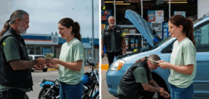 Marissa’s knees nearly gave out. The adrenaline that had kept her standing vanished, leaving her trembling and tears burning in her eyes. But the bikers didn’t mock her or judge her. Instead, one quietly slipped a few bills into her hand. Another checked her van, fixing a loose connection and topping off the oil. They said little, but their actions spoke volumes—kindness without fanfare, strength without arrogance.