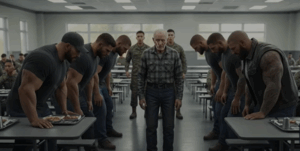 Eight elite warriors standing at ramrod-straight attention, their silent, unwavering respect aimed at the frail-looking old man in the flannel shirt. The mess hall had gone quiet. Everyone was watching. The clatter of trays and the low murmur of conversations had ceased. All that could be heard was the distant rhythmic pop of the training exercise.