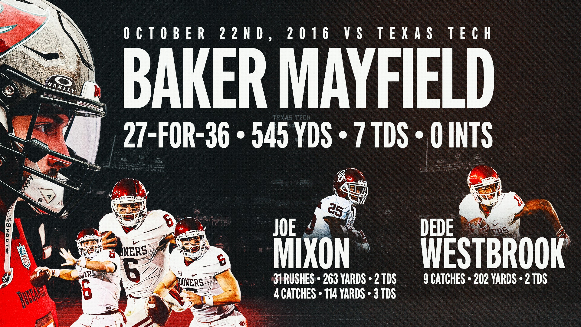 The two teams combined to score touchdowns on 10 straight drives in the second half, the last nine all at least 75 yards long. Oklahoma junior QB Mayfield finished with 545 passing yards and a school-record seven touchdowns, and Sooners running back Joe Mixon rushed for 263 yards and five total touchdowns. Texas Tech junior QB Mahomes threw a ridiculous 88 passes, completing 52, and tied a college football record with 734 passing yards and seven total touchdowns (five passing, two rushing).