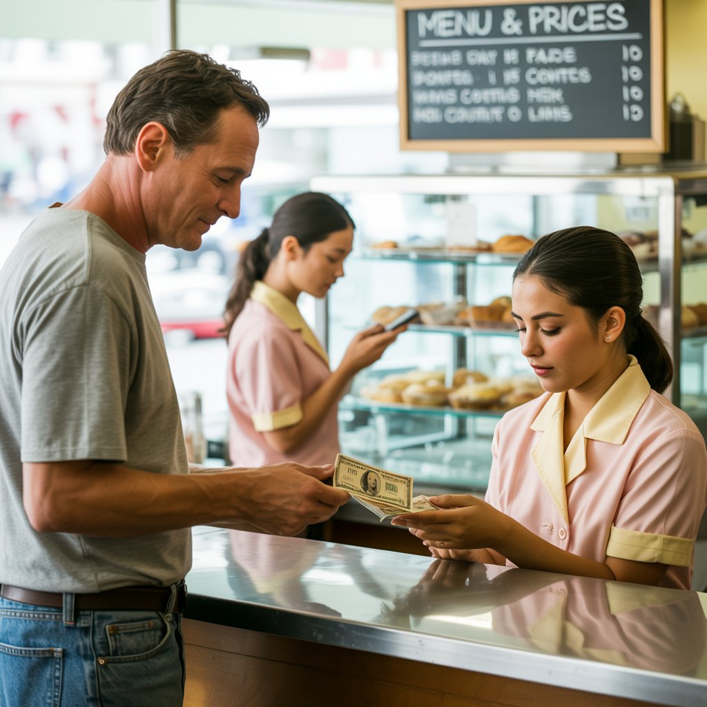 After thirty seconds without greeting, Denise barked, “Next!” Jordan stepped forward and politely ordered a bacon, egg, and cheese breakfast sandwich with black coffee. Denise sighed, rang up the order, and brusquely demanded payment. She snatched his crumpled ten-dollar bill and tossed the change on the counter without a word.