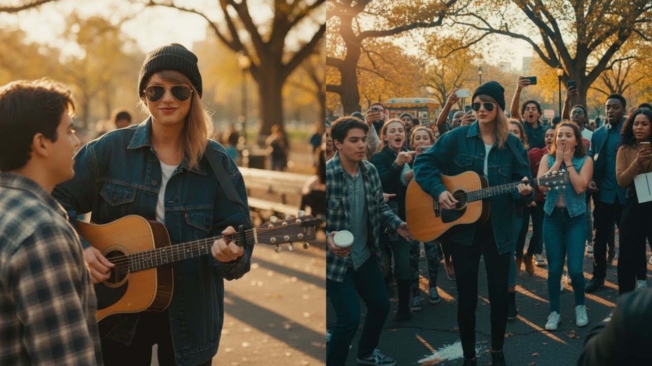 Taylor Swift stood at the edge of Washington Square Park in Greenwich Village, her heart pounding beneath the oversized hoodie that concealed her identity. In her hands, she held a battered acoustic guitar she’d bought from a pawn shop that morning for $85. A cardboard sign propped against an empty guitar case at her feet read, “Struggling musician.