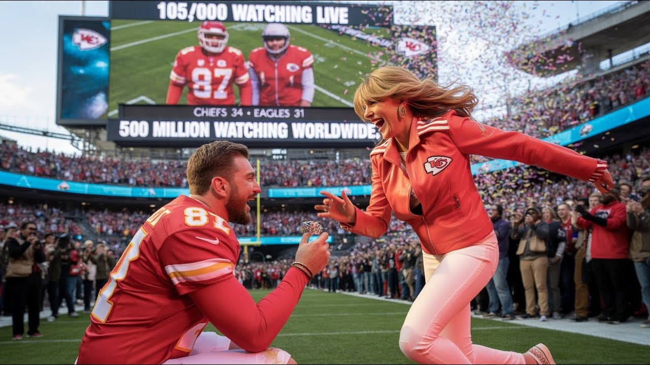 and that sometimes love means kneeling on a football field in front of 500 million people. Travis Kelce had just won his third Super Bowl. He’d caught the game-winning touchdown with 14 seconds left. Confetti was falling. His teammates were celebrating, but instead of joining them, he walked to center field, grabbed a microphone, and proposed to Taylor Swift in front of 105,000 people in the stadium and 500 million watching worldwide.