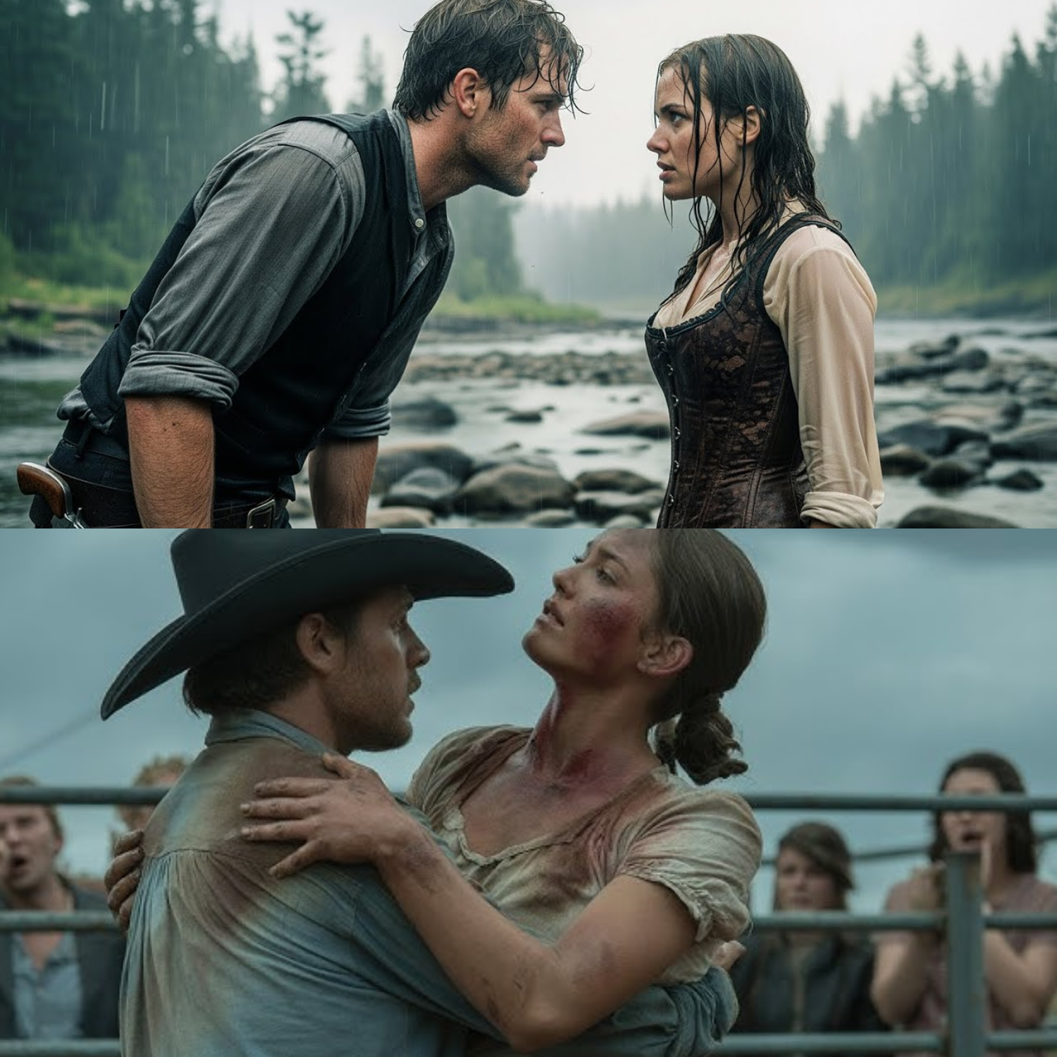 Then she coughed hard. Dirty water ran from her mouth. Her eyes opened—a moss green, hazy with pain and fear. “You’re safe,” he said, voice rough. “You’re on my land near the Wind River.” She tried to sit. Her dress clung to her like a second skin. She crossed her arms over her chest and shivered so hard her teeth clicked. “You need a fire,” he said. “My cabin is close.”