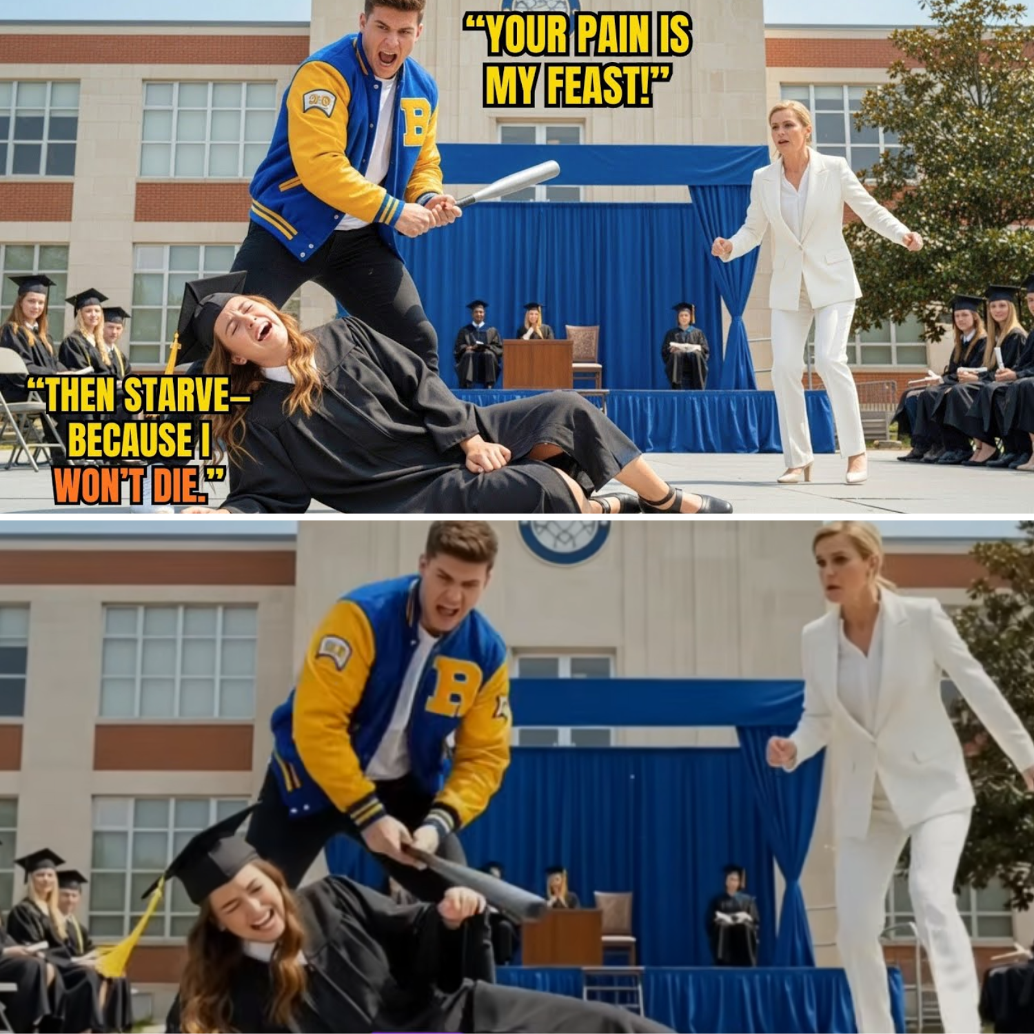 It happened in slow motion. Jax’s spotless, expensive white sneaker hooked precisely, surgically, behind her ankle. The world tilted. She fell—a hard, graceless collapse that punched the air from her lungs. Her knees and hands scraped against the rough asphalt under the thin layer of turf. Her mortarboard flew away, a spinning disc of blue humiliation.