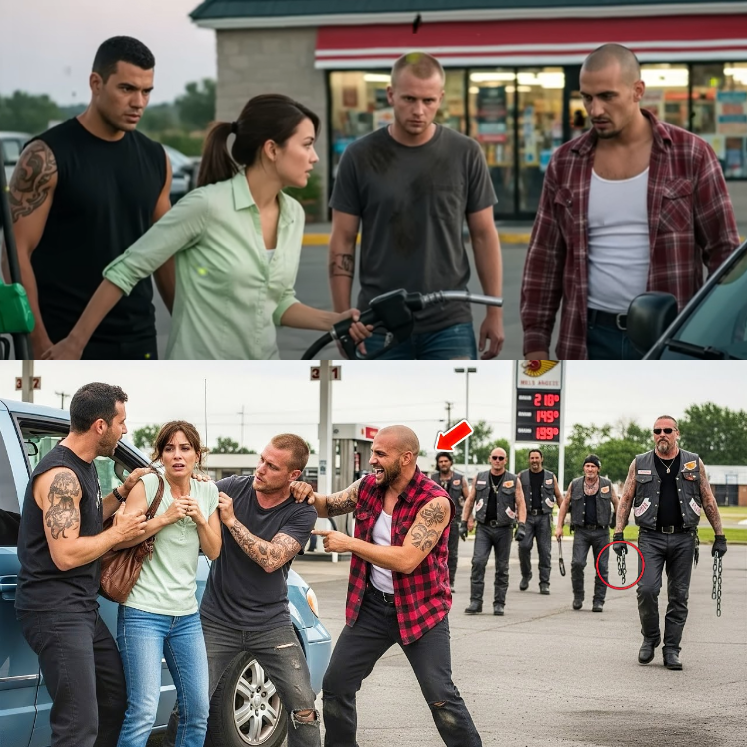 As she stood at the pump, three men swaggered out of the convenience store. They weren’t locals. Loud, tattooed, with mocking grins plastered across their faces, they radiated arrogance—the kind that feeds on fear. One crushed a soda can under his boot, another cracked a joke, and then their eyes landed on Marissa.
