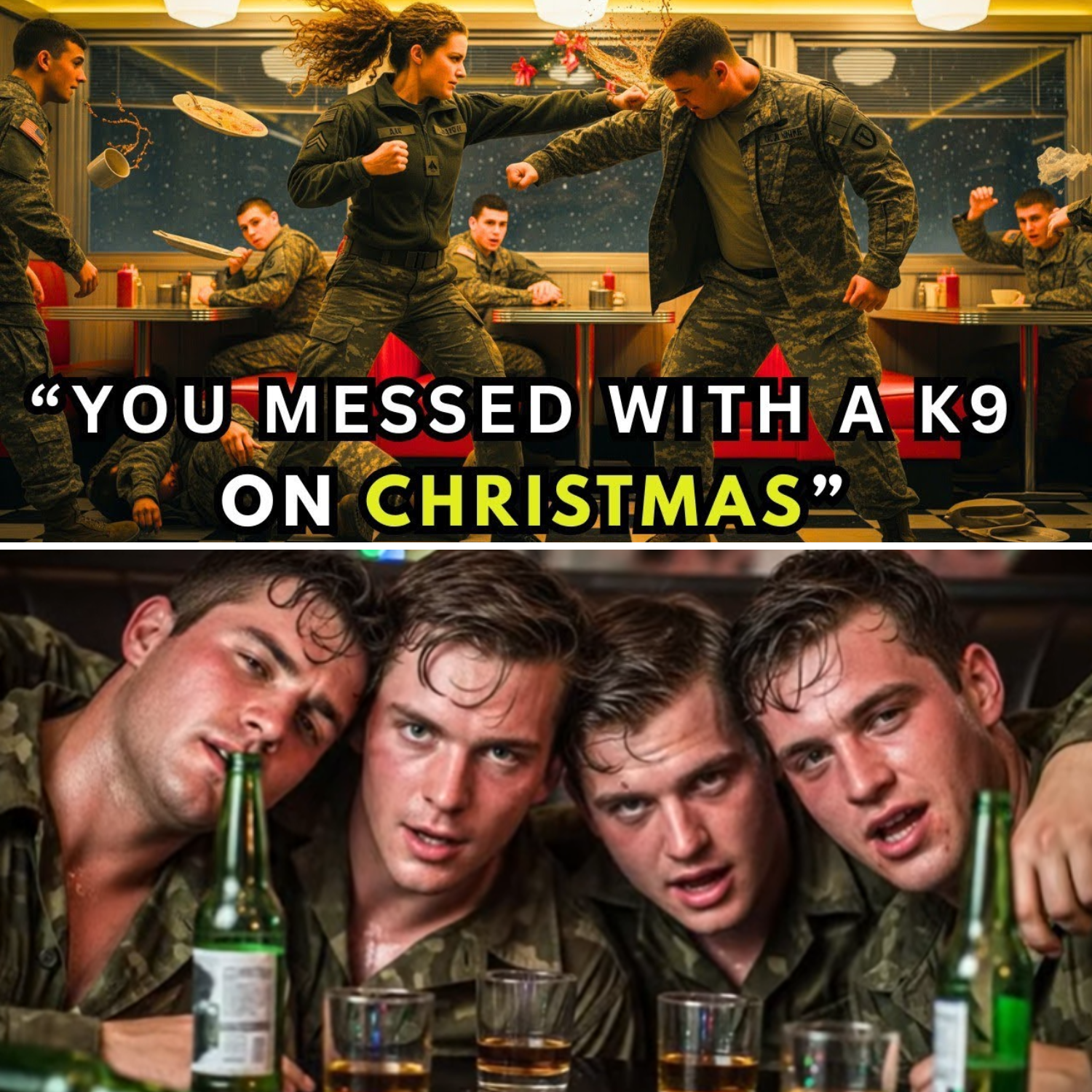 Christmas Eve, 11:43 p.m. The small diner just three miles outside Fort Bragg Military Base was a sanctuary of warmth amidst the chilling winter night. Snowflakes drifted down softly, blanketing the ground in a serene white layer, while holiday music crackled from the speakers, creating an atmosphere of cheer that contrasted sharply with the tension brewing inside. Most soldiers had already returned home to their families, but four male cadets from Bravo Unit remained, huddled in a corner booth, their laughter rising in volume with each passing minute as they indulged in cheap whiskey hidden beneath the table.