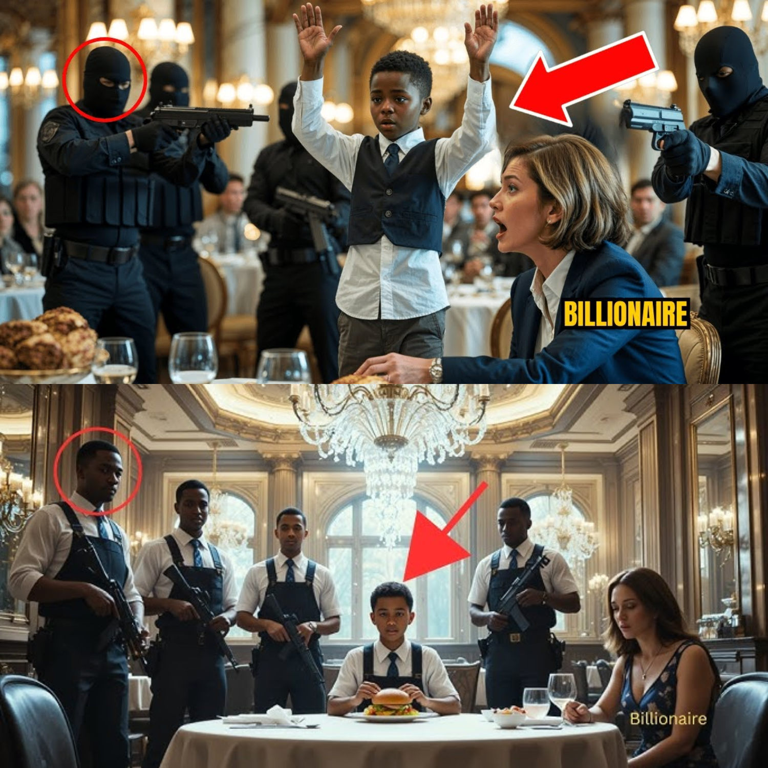 Amid the chaos, a stark contrast sat quietly at the next table—a black boy, no older than fifteen, calmly chewing a hamburger. Daniel Reeves, dressed in a simple school uniform with a worn backpack at his feet, appeared oblivious to the unfolding nightmare. His serene composure was unsettling. When one of the robbers barked at him to silence his phone, Daniel’s response was measured, devoid of fear. “I’m listening,” he said, wiping his mouth with a napkin. “My father always said wasting food is disrespectful to those who have nothing.”