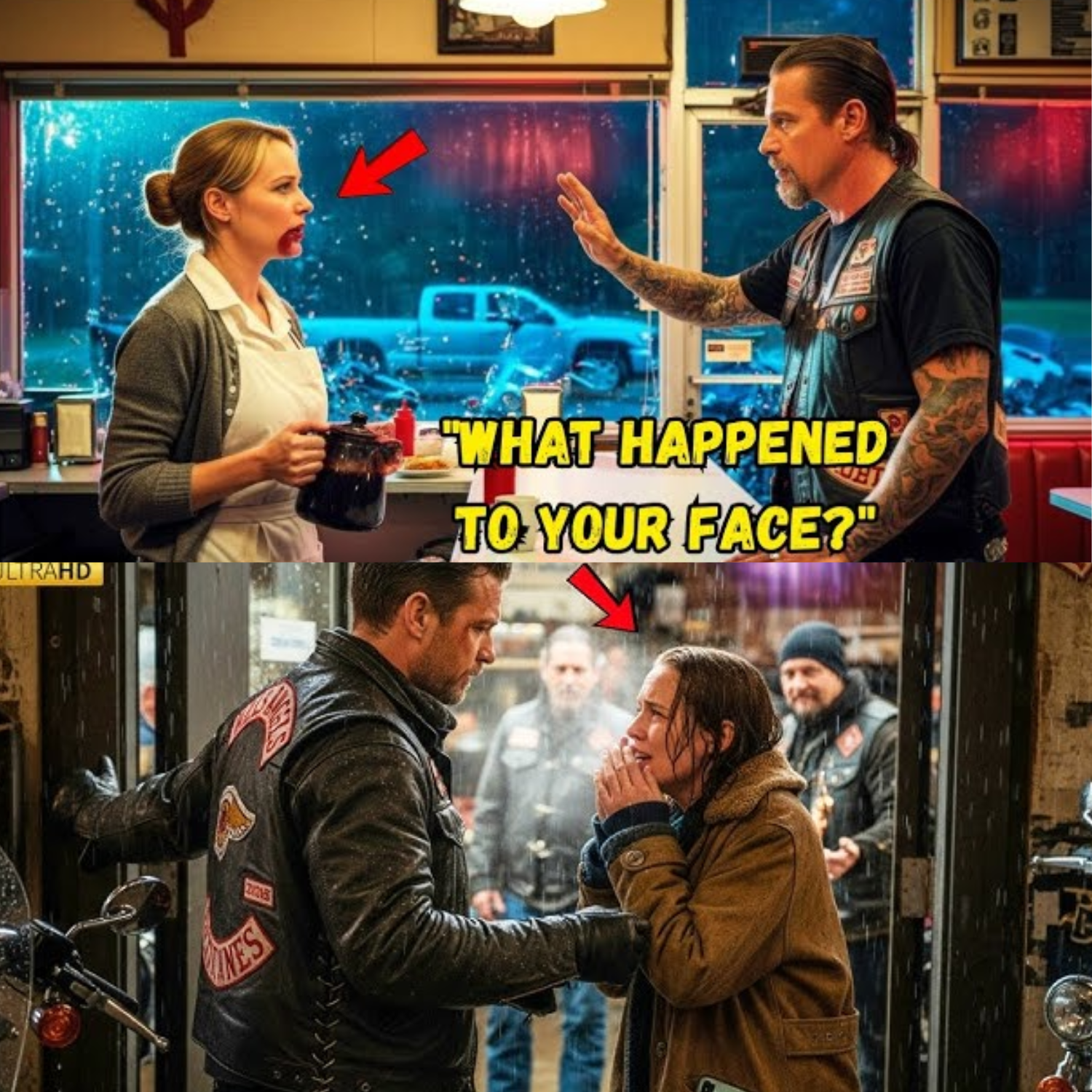 Marcus had seen every shade of cruelty on the road, in bars, and in the cold eyes of men who thought power came from fear. Yet tonight, something different caught his attention—something small, fragile, and far more unsettling than any fight he’d ever been in. Behind the counter, Lena Brooks moved like a ghost. She was the night cook and part-time waitress, working the graveyard shift for extra cash. Her uniform was neat but faded, her movements careful—too careful. Every time she smiled at a customer, her lips trembled slightly, as if kindness itself had become a risk. And that’s when Marcus saw it—a dark, ugly bruise at the corner of her lip. It wasn’t an accident or clumsiness. It was a mark that told a story of silence, pain, and nights spent pretending nothing happened.