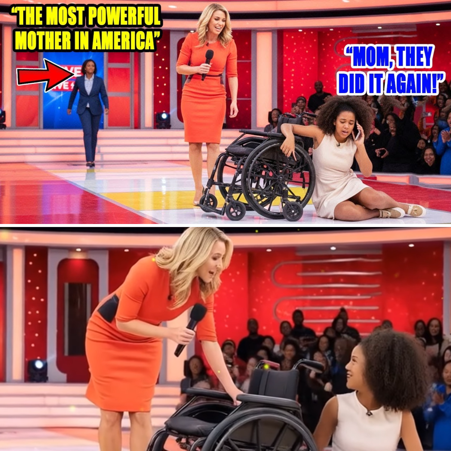The studio lights blazed down as Amara lay on the floor, stunned, humiliation burning in her cheeks. The cameras cut to commercial, but the damage was viral before the ad break ended. Clips flooded social media: freeze frames of Amara sprawled on the stage, hashtags of mockery, and a wave of cruelty that felt as old as television itself. Backstage, Amara sat trembling, a towel around her shoulders. No one spoke. Crew members passed by, whispering, “She shouldn’t have come on if she can’t balance.” Her throat tightened. She whispered into her phone, “Mom, they did it again.” The line was silent for three seconds, then her mother’s voice, calm and unshakable: “Stay where you are, honey.”