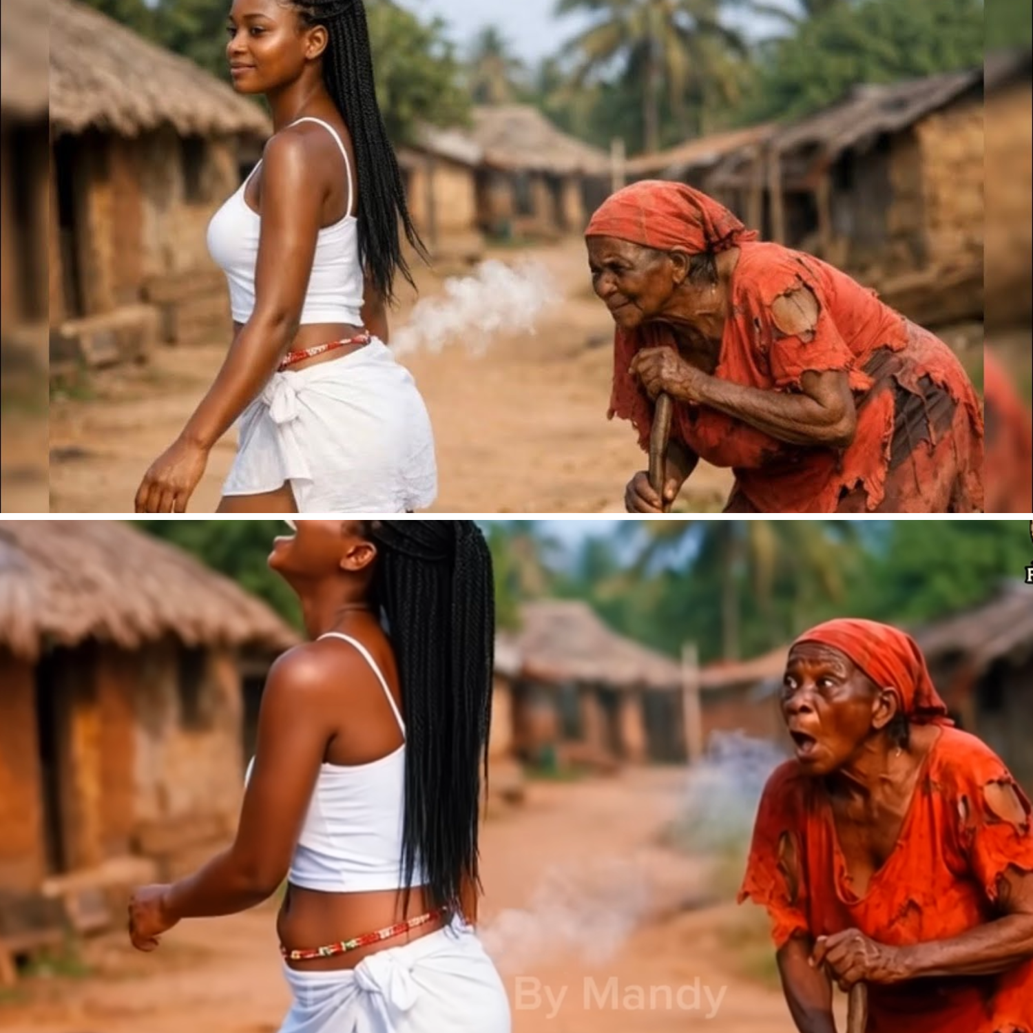 “No way!” she whispered in disbelief. Each step she took was accompanied by a symphony of embarrassing noises, her pride crumbling with every fart that escaped her. In a frenzy, she turned back to confront the old woman, demanding answers. “What did you do to me?” she shouted, her voice a mix of anger and desperation.