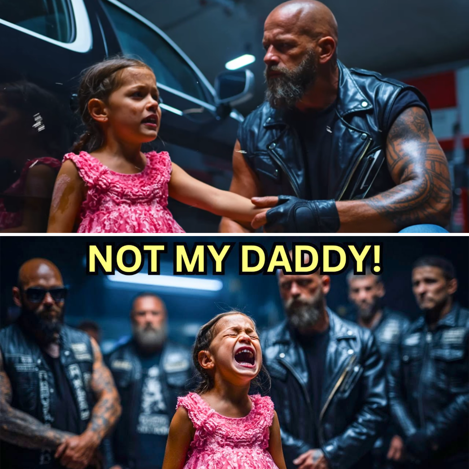 Diesel, the club president, stepped forward—six-foot-five, arms like tree trunks, intimidating even when he smiled. But today, he wasn’t smiling. He knelt down to the girl’s level, voice gentle. “Hey there, little one. That’s a pretty cool unicorn shirt. What’s your unicorn’s name?” The man tried to pull her back. “We don’t talk to strangers.” But the girl found her courage. “He’s not a stranger,” she said, looking at Diesel’s vest. “He’s a helper. My mommy said if I’m ever scared, find helpers. Police or firemen or knights.” Diesel smiled, showing his vest. “You have armor?” She pointed at the leather and the iron horses. “Just like in my books.”