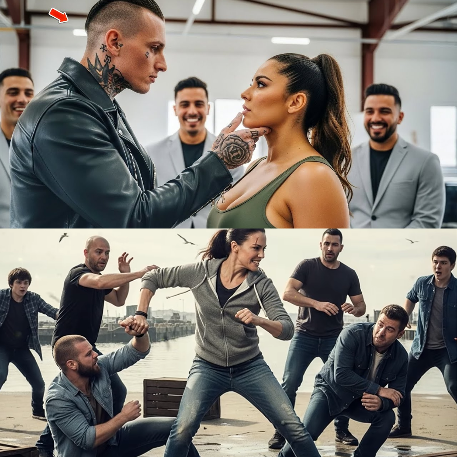 One foggy morning, Arya woke to shouting near the docks. A group of local men—thick jackets, heavy boots, arrogance dripping from every word—had cornered a teenage boy near the old boatyard. They accused him of stealing, though he swore he hadn’t. Arya recognized the tone of mob cruelty. It was the same she had once faced in uniform. Her instinct flared before thought could intervene. She walked toward them, voice low, commanding yet calm. They laughed. One stepped closer, his smirk wide as he looked her up and down. “Old lady, go home. This isn’t your fight.” But Arya stood her ground, eyes cold as steel. When he shoved her shoulder, something inside snapped. The years of silence, humiliation, and betrayal surged back. In a blur, she disarmed the man, twisted his wrist, and sent him crashing into the sand. The others hesitated, stunned by the precision of her movement, the absolute authority in her stance. She didn’t want to fight, but when they charged, she moved like a storm. Her body remembered every drill, every combat reflex. The boy ran to safety as Arya faced them all—one against five. When the dust settled, they lay groaning on the ground, defeated not just by her fists, but by the sheer, unbreakable presence she carried. She turned away, breath steady, and the whispers began to spread across the town. That woman fought like a general.