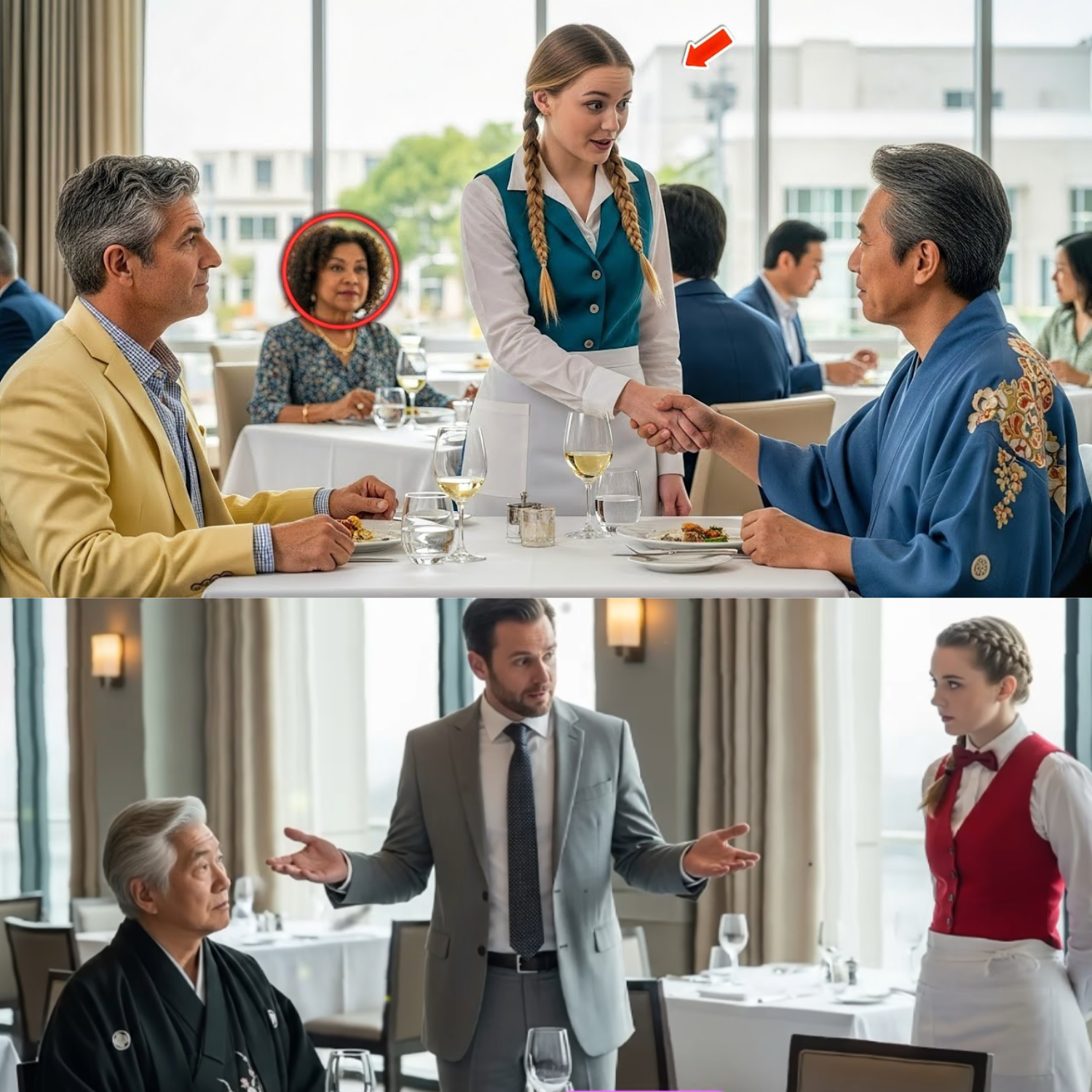 The morning sun streamed through the towering glass windows of the five-star restaurant, casting a golden glow over polished tables and half-empty champagne flutes. The air was thick with a tense silence, the kind that only fills rooms where billionaires and tycoons sit across from each other, trying to seal deals worth more than most people will ever see in a lifetime. At the center of this high-stakes battlefield sat Charles Donovan, a billionaire who owned half the New York skyline, yet at that moment appeared utterly helpless. His face was pale, hands fidgeting nervously as his eyes darted between a small black notebook and the elderly Japanese businessman sitting opposite him. The translator—his crucial lifeline—had canceled just an hour before. Now, without anyone to bridge the language gap, the multi-million dollar partnership he had chased for months was slipping through his fingers like sand.