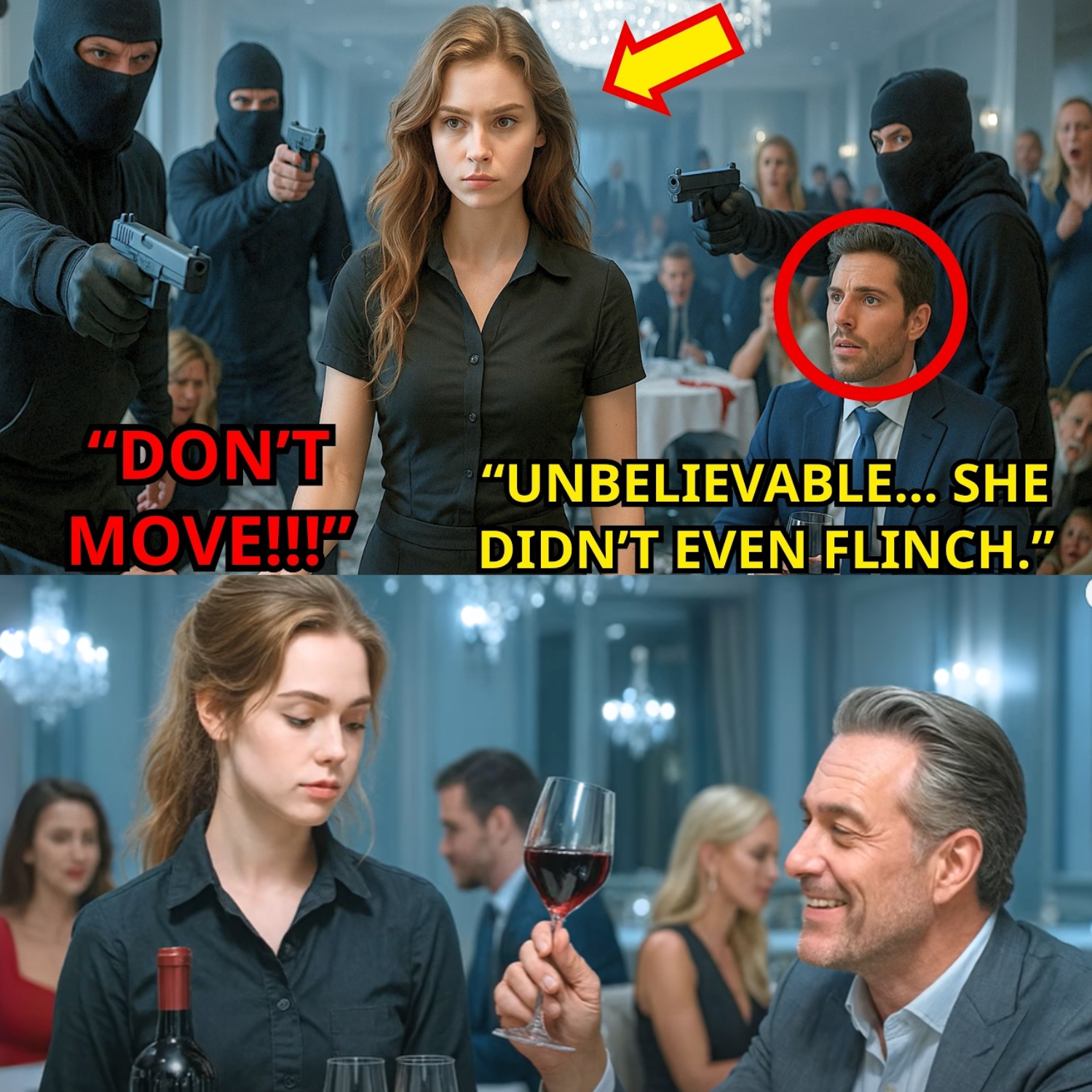 James Colton, the billionaire, froze, fingers fumbling to pull off his watch and ring, ready to hand them over. Anna stood in the center, holding a tray of empty glasses. She didn’t drop it. She didn’t scream. She just stood there, eyes scanning the robbers—one, two, three—like she was counting exits. The leader, stocky with a scar above his eyebrow, zeroed in on her, gun aimed at her chest. “What’s wrong with you? Get on the floor!” The other two shouted at guests, waving guns, demanding wallets and jewelry. A woman at a nearby table, pearls clutched tight, whispered, “She’s insane. Why isn’t she moving?” Anna’s grip on the tray was steady, her breathing slow, almost too calm.