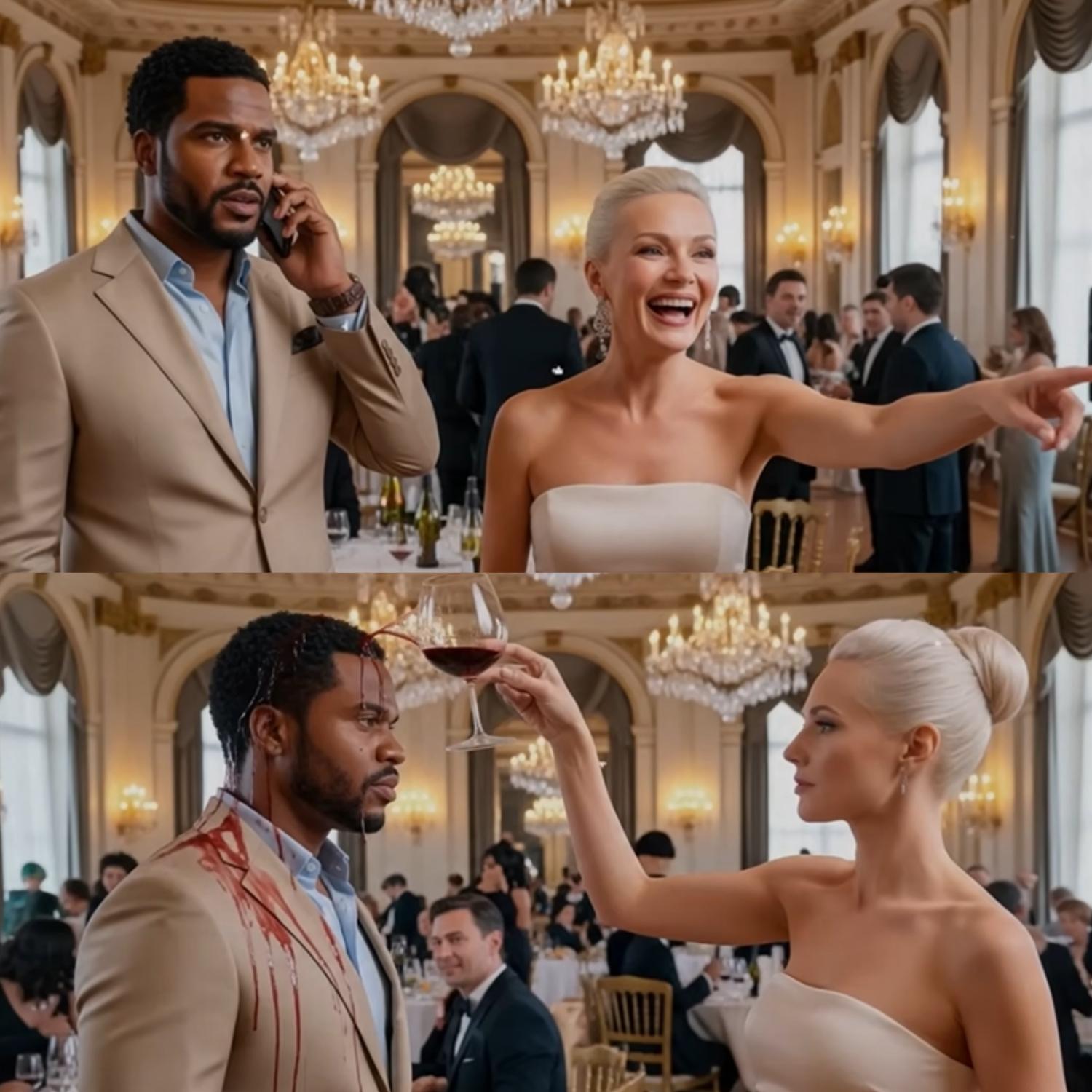 “You know,” she continued loudly, “some people just don’t know when they’re out of their depth.” Marcus met her eyes. “And some people don’t realize when they’re out of their character.” The tension was electric. A waiter froze mid-step. Cameras tilted discreetly. Evelyn’s smile tightened. She reached for a nearby glass of wine. “You must be thirsty,” she said, and before anyone could react, she poured the red wine across his chest. Gasps filled the ballroom. The liquid splashed across the marble floor. Silence followed—cold, suffocating silence.
