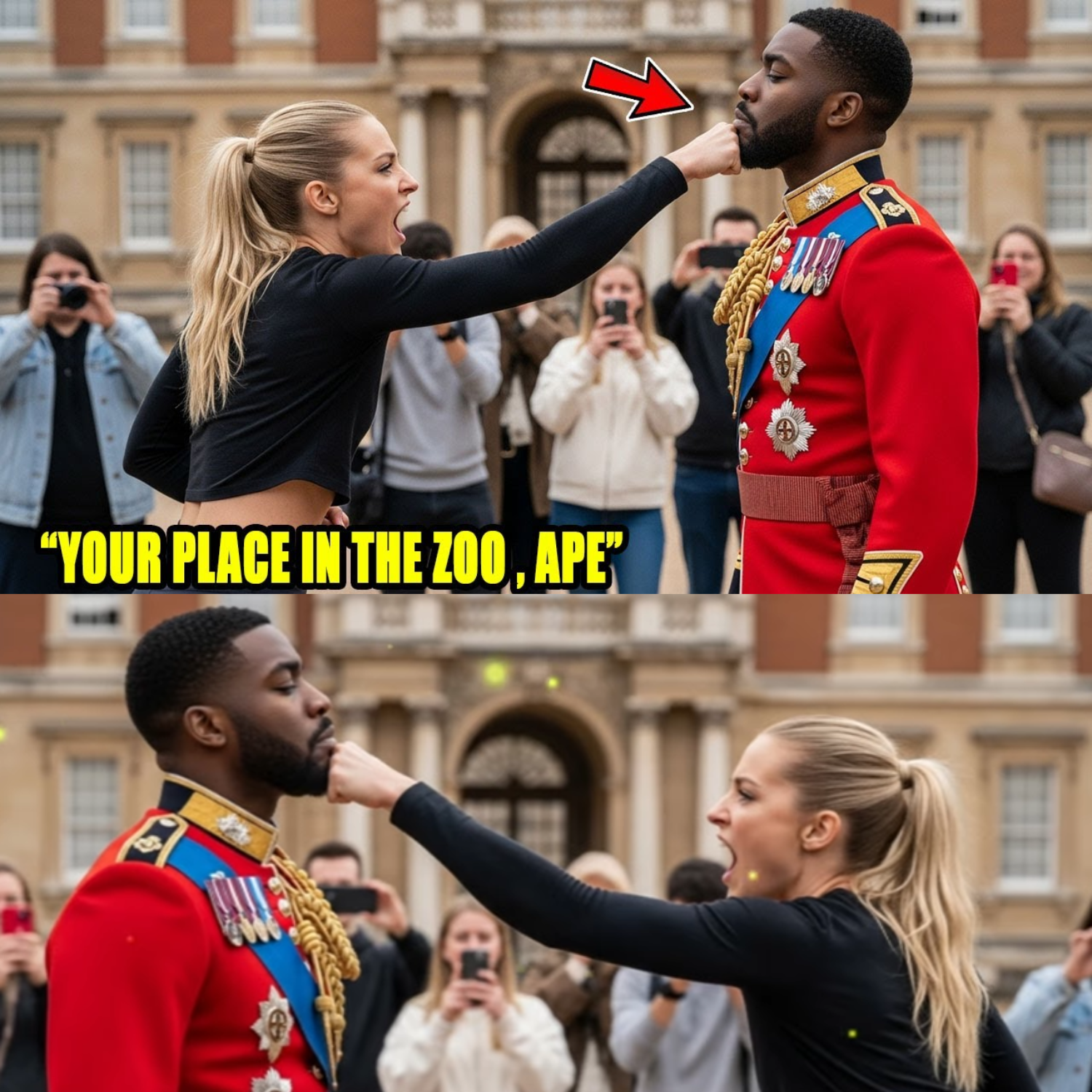 Can dignity survive when hate is shouted in your face? On a blinding morning at the palace gates, Vanessa Cross—a ruthless live streamer intoxicated by viral fame—decided she’d make her next spectacle out of the one man who never flinched: Elijah Vance, royal guard, a pillar of discipline and silent pride. Vanessa’s camera was rolling. Her followers numbered in the millions, hungry for drama. She strutted into the scene with a toxic confidence, determined to prove her twisted thesis: that palace guards were nothing but overpaid, overhyped mannequins. Her target was Elijah—a Black guard who’d stood his post for nearly a decade, unmoving, unyielding, and, in her eyes, ripe for humiliation.