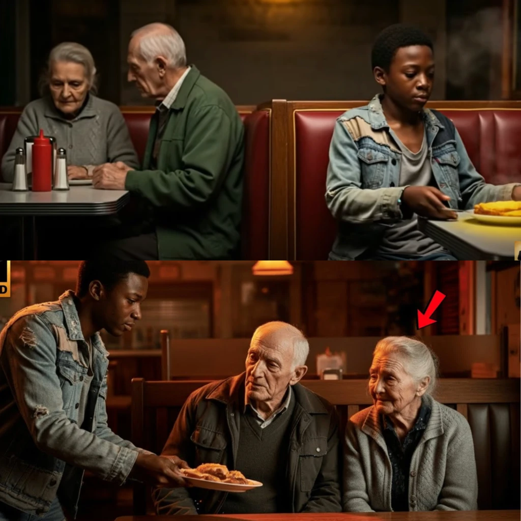 In a small, quiet town where life often moved at a slow, predictable pace, a scene unfolded in a humble diner that would ripple far beyond its worn wooden tables and flickering neon lights. Marcus Green, a thin, 14-year-old boy with shoes worn thin from endless walking and a heart heavier than his empty stomach, sat alone at a corner table. Before him lay a single plate of food—a meal he had painstakingly saved for all week, a rare reward in a life marked by struggle and sacrifice. His eyes, however, were drawn not to his own steaming plate but to an elderly couple seated nearby, their hands clasped tightly together, their plates empty, their dignity quietly eroding in the silence of hunger.