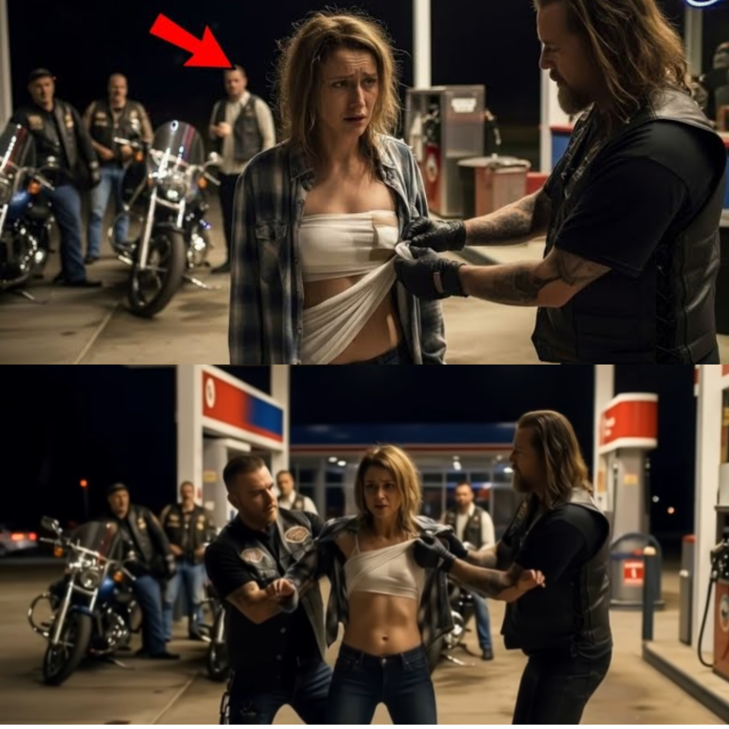 The desert night was thick with dust and gasoline, the distant engines rumbling like thunder across the empty highway. Under the flickering neon of a lonely gas station, a girl staggered into the light—barefoot, bruised, and barely holding together. Her flannel shirt hung off her shoulders, streaked with dirt and dried blood. Her eyes, hollow and wide, looked like they’d forgotten what safety was. The only sound was her ragged breathing and the faint buzz of the neon “OPEN” sign. Then the night split open: a convoy of motorcycles tore down the blacktop, headlights slicing through the dark. The Hells Angels had arrived.